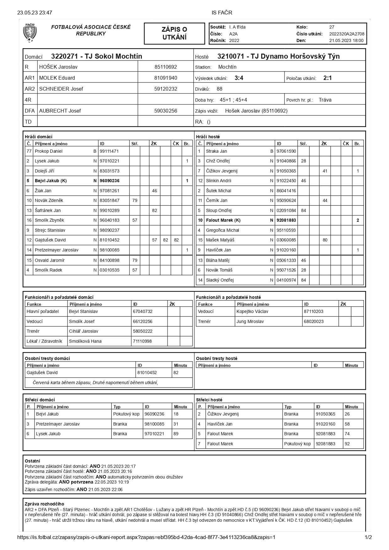 Sestava Mochtína: Prokop Daniel, Dolejš Jiří, Šafránek Jan, Gajdušek David, Lysek Jakub, Bejvl Jakub, Smolík Zbyněk (57. Smolík Radek), Žiak Jan, Strejc Stanislav, Novák Zdeněk (79. Osvald Jaromír), Pretzlmayer Jaroslav